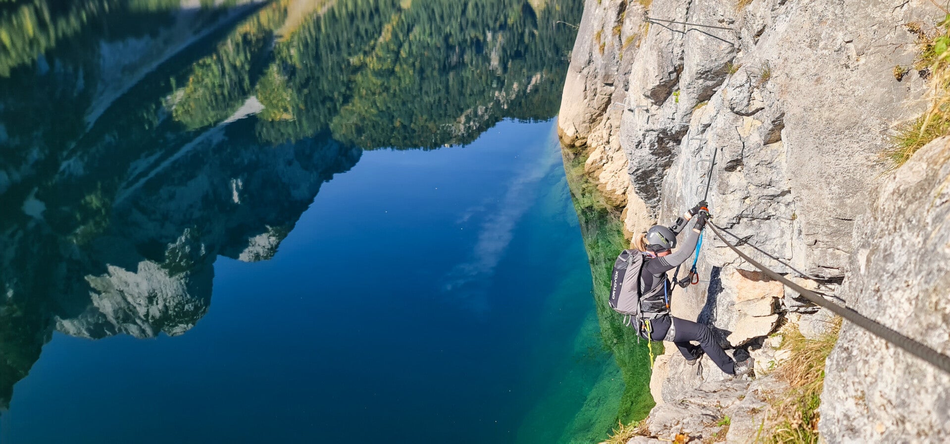 Der Laserer Alpin-Klettersteig verläuft direkt über dem Wasser des Vorderen Gosausees. Er ist ein bestens abgesicherter Plaisir-Klettersteig mit 420 Klettermetern. Die Tour ist Dank des ständigen Blicks auf den Dachstein und die Nähe zum See landschaftlich sehr eindrucksvoll.